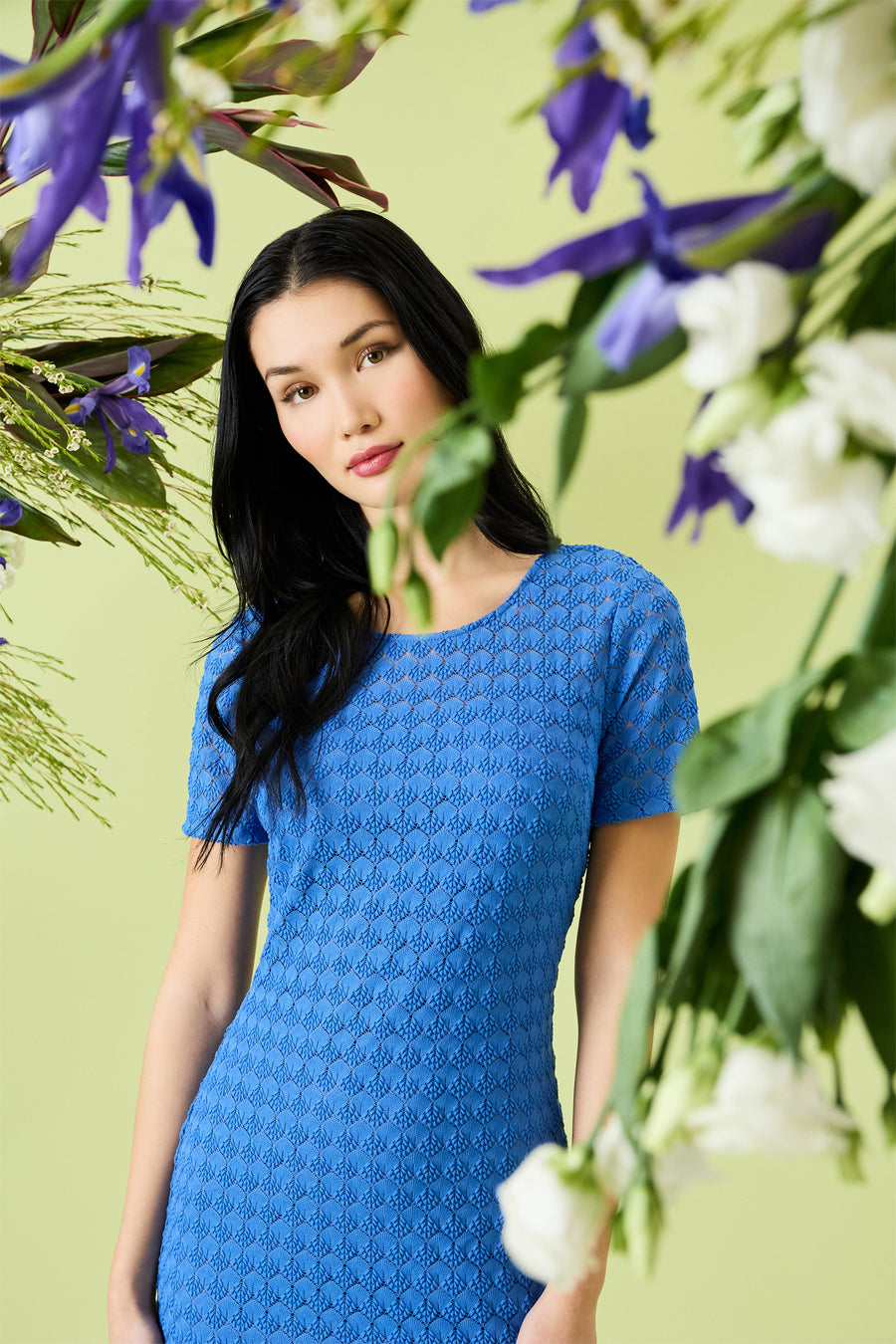The Amani dress reimagines classic crochet in a sophisticated midi silhouette, featuring an intricate pattern that catches the light with every movement. This form-fitting design with short sleeves and a subtle side slit strikes the perfect balance between elegance and allure, ideal for garden parties, summer weddings, or sophisticated beach events. The delicate craftsmanship adds texture and visual interest while maintaining a timeless appeal that transitions beautifully from daytime soirées to evening gatherings.