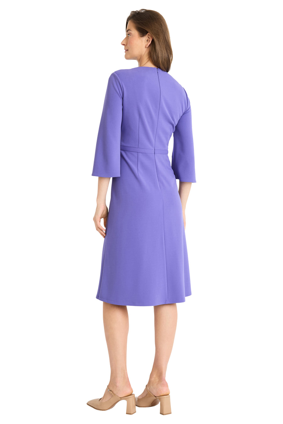Introducing Sabina, a dress that embodies timeless elegance. Crafted from luxurious scuba crepe, this midi length stunner features a unique asymmetrical neckline and sleek 3/4 sleeves. The delicate bow belt adds a feminine touch to its clean lines. Perfect for sophisticated office wear, upscale luncheons, or evening cocktail parties.
