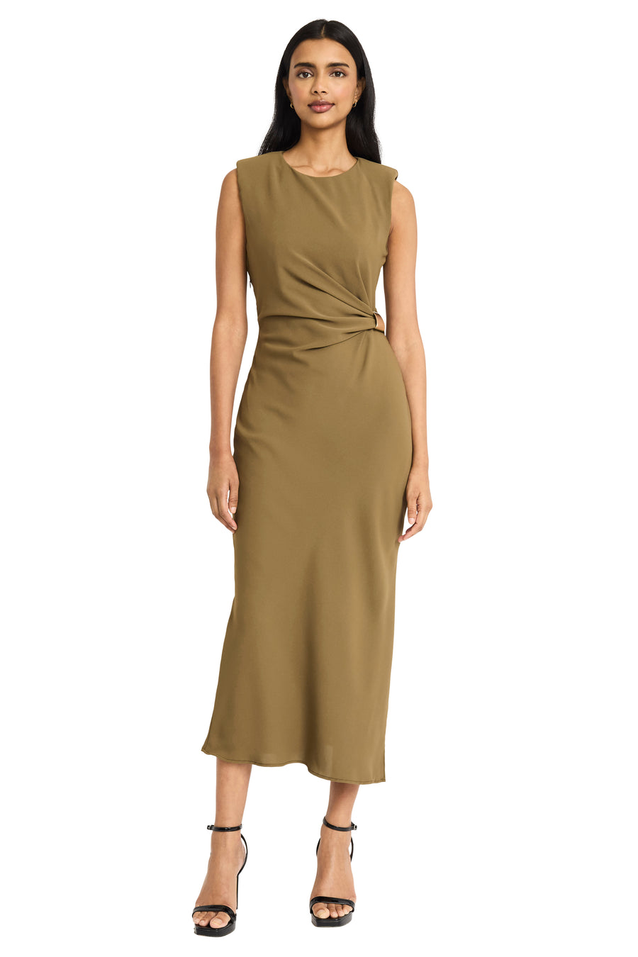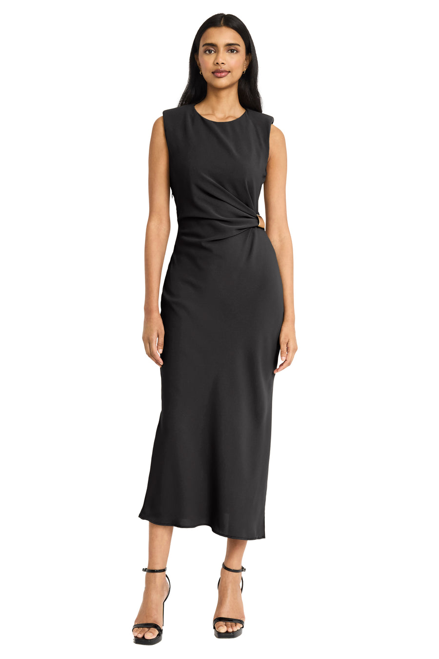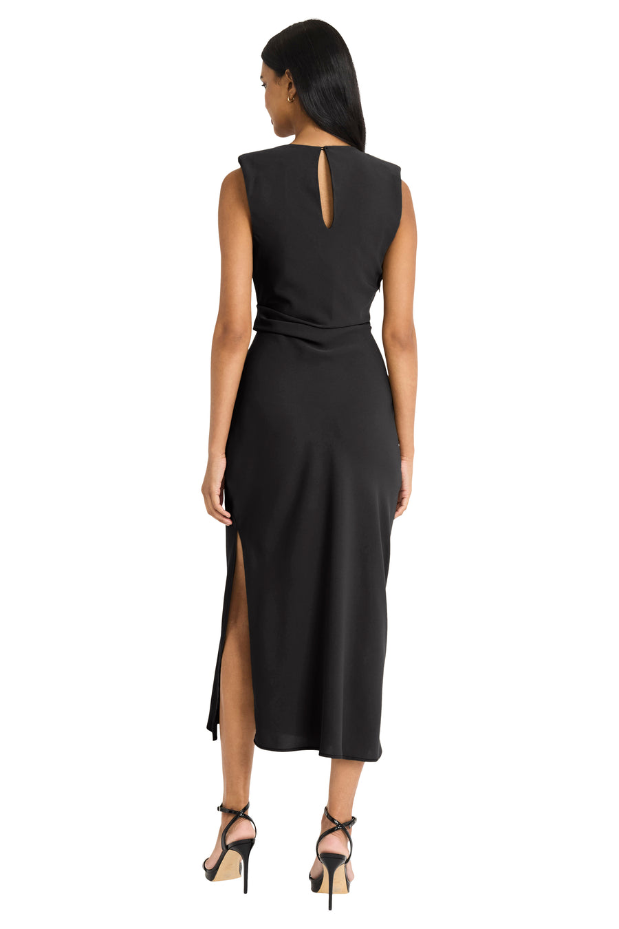 Giorgia embodies sophisticated minimalism with its sleek midi silhouette and elegant side-twist detail that creates a naturally flattering waistline. The sleeveless design and luxurious drape make this piece perfect for transitioning from professional settings to evening events with effortless grace. Pair with heels and statement jewelry for formal occasions, or dress down with flats and a blazer for polished daytime elegance.