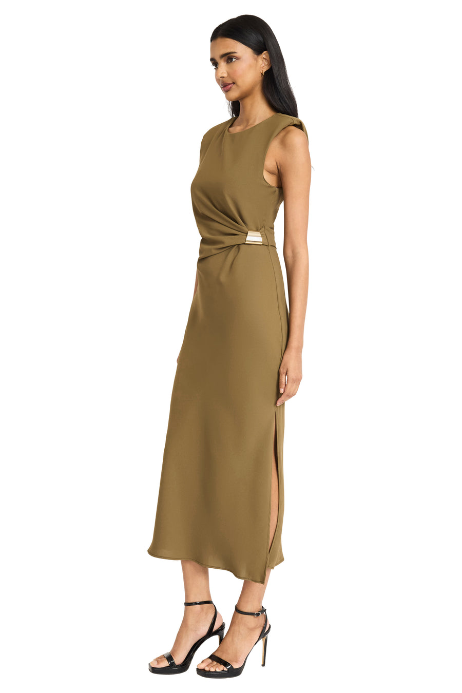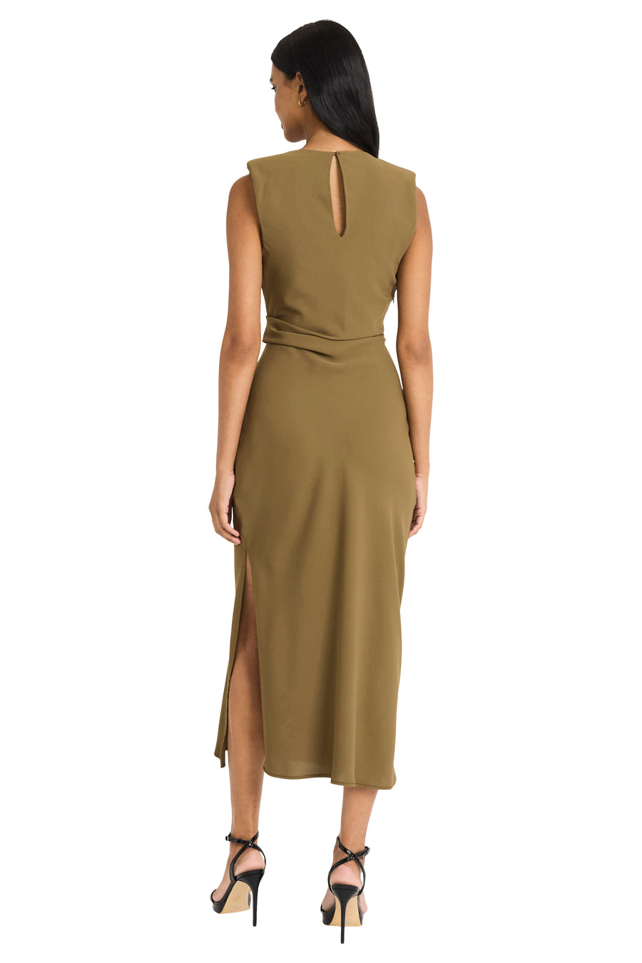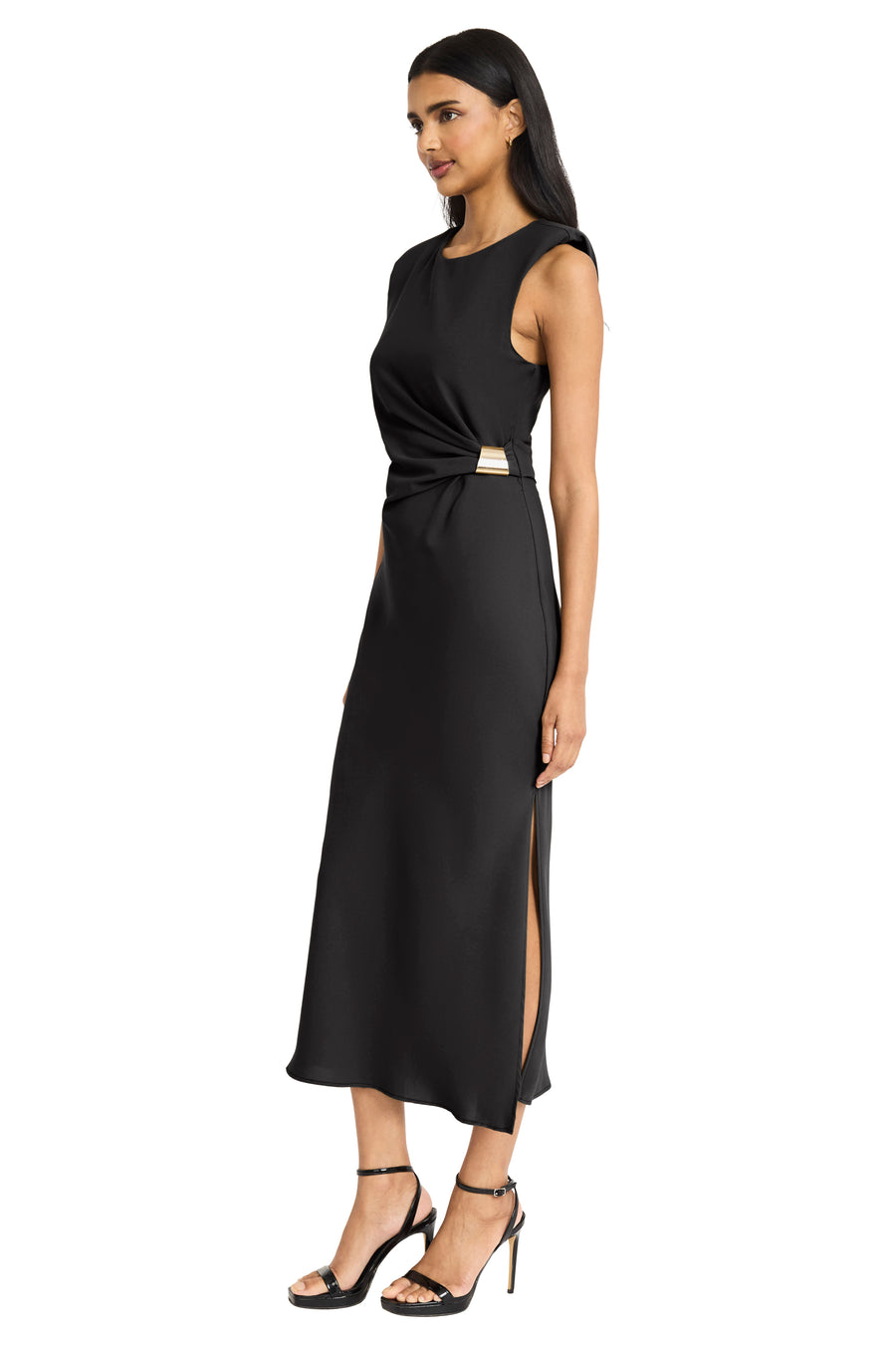 Giorgia embodies sophisticated minimalism with its sleek midi silhouette and elegant side-twist detail that creates a naturally flattering waistline. The sleeveless design and luxurious drape make this piece perfect for transitioning from professional settings to evening events with effortless grace. Pair with heels and statement jewelry for formal occasions, or dress down with flats and a blazer for polished daytime elegance.